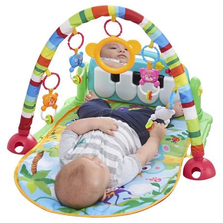 Moveable toys on the overhead gym encourage babies to flap and grab while laying on their back.