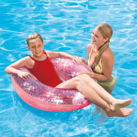 for sparkly Summer fun in the pool, this inflatable tube features a transparent top filled with glittery confetti inside