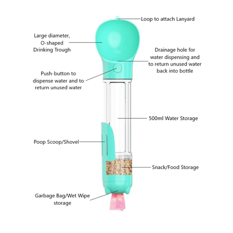 1 x Multifunction Portable Pet Drinking Water Bottle including Food Snack, Poop Scoop & Bag Storage