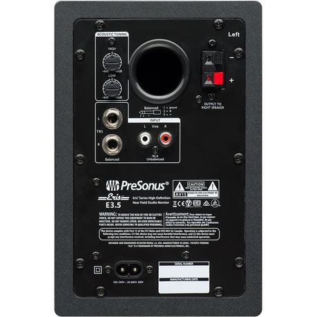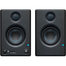 Presonus Eris E3.5 BT; active studio monitors with Bluetooth connectivity; 3.5" woofer, 1" tweeter with silk done; frequency range 80 Hz - 20 kHz; max SPL: 100 dBA SPL (peak); inputs: TRS jack (L/R, balanced), Cinch pair (L/R); 3.5mm stereo jack, Bluetooth 5.0; frontside headphone jack (stereo mini jack); front volume control with on/off switch and operation LED; Class AB amp (2x 25 W sinus); switch-on delay and output current limiter, overheating protection and subsonic filter, incl. Mini jack cable (TRS to TRS), 1.5 m, adapter cable (mini jack TRS to 2x Cinch), 1.5 m and connecting cable from left to right speaker, dimensions (WDH): 210 x 141 x 162 mm, weight: 2.9 kg