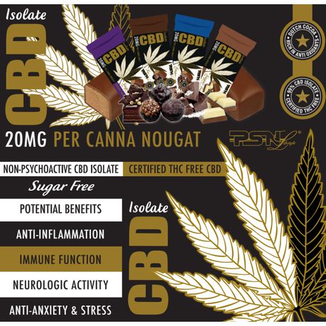 The Worlds 1st High Protein Sugar-Free Meal Replament Canna Nougat Bar infused with antioxidant Rich Cacao, Dutch Cocoa and 20MG of CBD Isolate, extracted from the highest quality THC-Free Hemp. There is 0% refined sugar added to this delicious guilt-Free Canna Nougat, making it suitable for Diabetics too. Potential benefits of supplementing with our Non-Psychoactive CBD Isolate may include Anti-inflammation, Pain relief, Immune function, Neurologic activity, and Anti-anxiety & Stress.