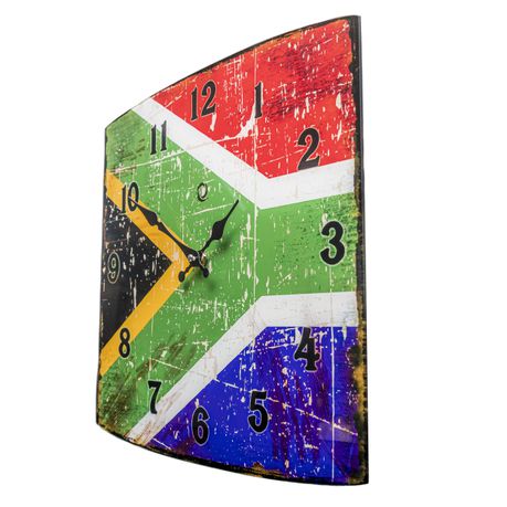 The South African Flag patriotic inspired theme of the clock makes it an ideal decorative piece for any living area in your home. The clock has a definite rustic look.