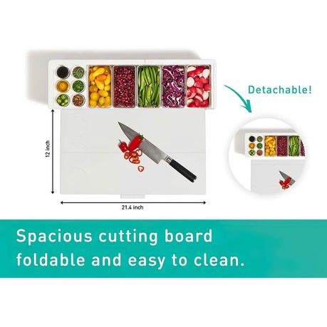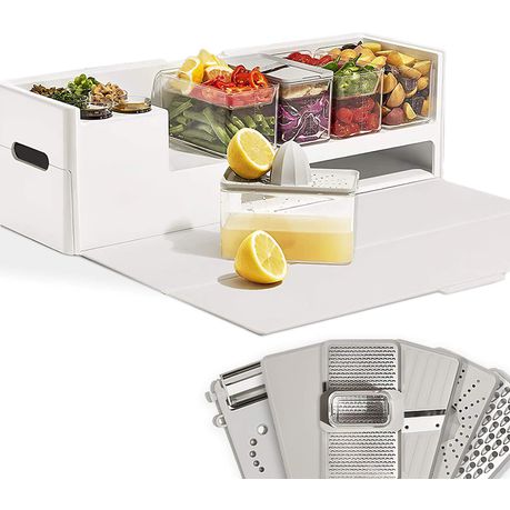 45+ features + storage: cutting board offers a generous 21.4" x 12" of cutting surface, 15 BPA free meal prep containers - 5 large, 2 medium, 2 small, 6 mini with measurement markings in ounces, cups, and milliliters; removable 13” trash bin & utensil storage. Multi-use prepping tools: grater, zester, juicer, slicer, garlic grater, vegetable peeler, julienne, green stripper, and bottle opener.