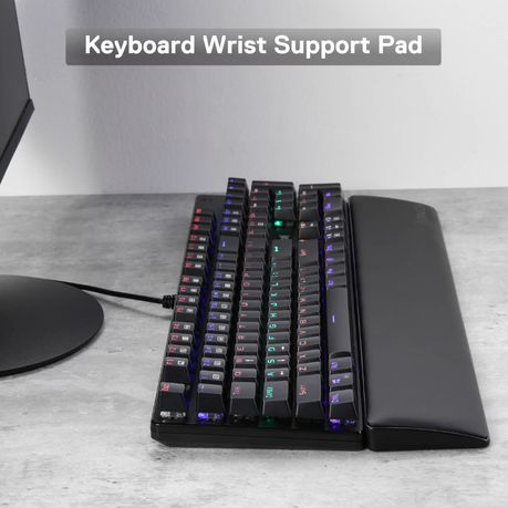 The wrist pad features a 20 mm pad height with a perfect 8° tilt angle, making sure your hands are naturally laid on the keyboard without your wrists hanging. Enjoy more comfortable typing with a less sore wrist feel after hours of use. The pad base is attached stably with 6 anti-slip rubbers, which provides more stability and support for the wrist pad. The METEOR Gaming Keyboard Wrist Pad comes in a variety of sizes. This particular one is designed for 80% tenkeyless keyboards.