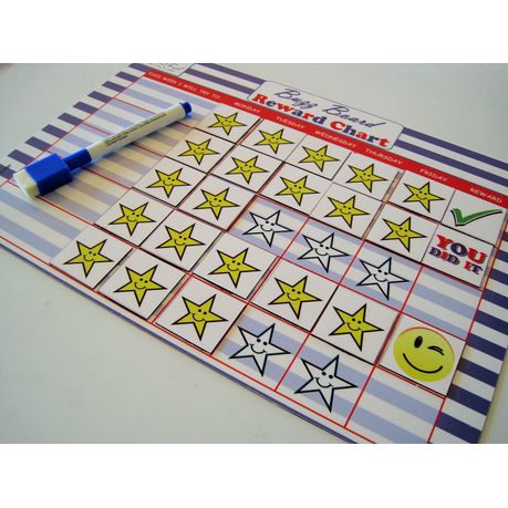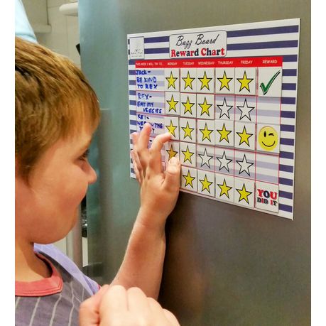 It comes with a set of star or reward magnets as well as a marker pen. Simply erase the weekly aims and start fresh each week.