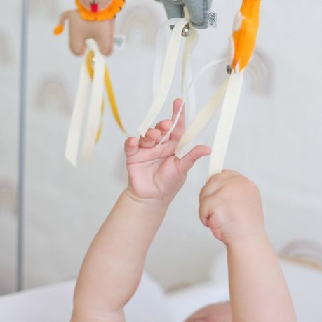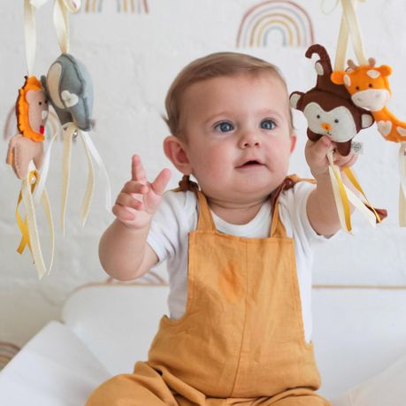- Tie your dingle dangles to sit at roughly 20cm from your little one - this is the average newborn depth of field and is the perfect height for babies to touch, kick and keep them entertained