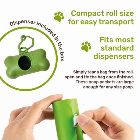 These eco-friendly pet waste bags are easy to use, and included in the package is a small, bone-shaped dispenser for convenient transportation. So when you need to do a cleanup, you take out the holder, tear off one bag from the roll, open the bag, scoop in the pet waste and tie securely. This bag is large enough to accommodate any size of excrement and is leakproof.