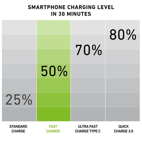 - Smartphone charge level after 30 minutes with Intelligent Charge: 50% *