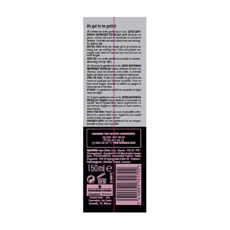 It's got to be got2b! Discover the real gentleman in you with our barber shop inspired grooming range. The got2b phenomenal lightweight styling gel gives your hair structure & shine without stickiness. The non-flaky, lightweight formula is also ideal for longer hair. Suit up & get ready to be phenomenally groomed.For groomed styles, No stickiness, Structure & shine, Non-sticky, Medium hold3. How to look phenoMenal:Take a small amount of product & rub into the palm of your hands. Apply on towel-dried hair, comb through & create your barber shop inspired look. Let your hair dry naturally. Not for use on beards or facial hair.Extra Tip:To be the perfect gentleman be as suave as your style. Note: Original Schwarzkopf Product from Henkel no English on Back of Packaging