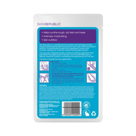Cleanse feet, tear open sachet and remove booties, place feet inside (taking care to make sure your foot is inside the inner layer), wear for 15-20 minutes, remove masks, do not rinse.