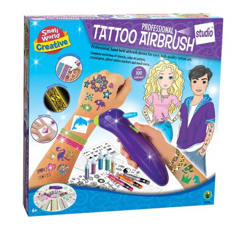 What fun! Young artists can give themselves and their friends colourful temporary tattoos with this professional airbrush device and all the creative items included! A complete workshop of stencils, colour-in tattoos, crystal gems, glitter tattoo markers and much, much more!