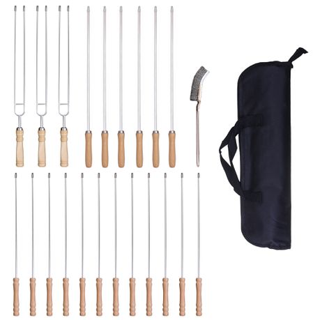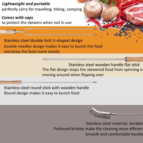 This set includes 12 round skewers, 6 flat skewers, 3 U-shaped skewers, 1 steel brush and 1 storage bag.