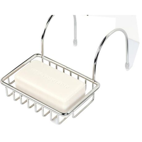 Stainless steel soap dish hooks neatly on the side of the bath to ensure soap is on hand.