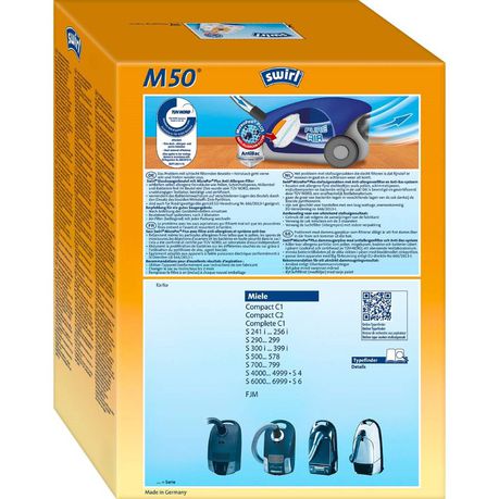 4x top-quality vacuum bags + 1 filter Swirl AirSpace Type M50 Swirl Staubfilterbeutel with AirSpace Technology - Long Power - assures highest suction power and filtration until the bags is completely full. A seperate filter chamber filters the dust and provides a better dispersion of dust within the bag. A visibly better cleaning power is provided by Anti-Allergenous-HEPA Filtration.