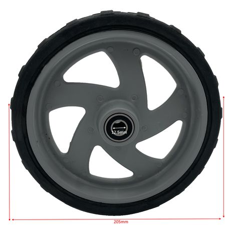 Tandem 8 inch 200mm Heavy Duty Wheel. Fits almost all lawnmowers, including Tandem, Trimtech, Professional must change stub axles, Southern Cross, Lawnstar, Wolf and Rolux. One of the toughest wheels available, comes complete with industrial steel roller bearings. Inner diameter of wheel is 12.5mm. Also used for braai wheels and other applications.