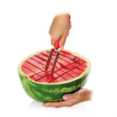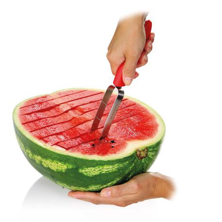 - Easily and quickly cuts the flesh of a watermelon into cubes or large sticks