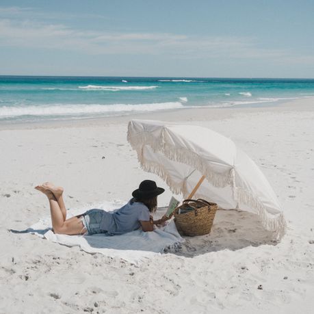- Materials: Cotton canvas top, wood pole, cotton tassel fringing