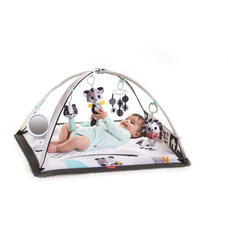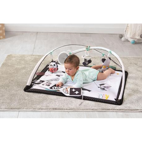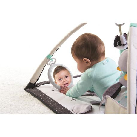 - Baby activated musical toy with 3 melodies, Wind chime badger, Fun fox rattle, Soft take-along book, Shiny satin ribbons, Star teether, Playful plush cloud, Crinkly peek-a-boo tree, Machine washable mat, Mirror for extended tummy time, Stimulating black & white mobile, Adjustable arches provide an adaptable environment for baby's continued growth
