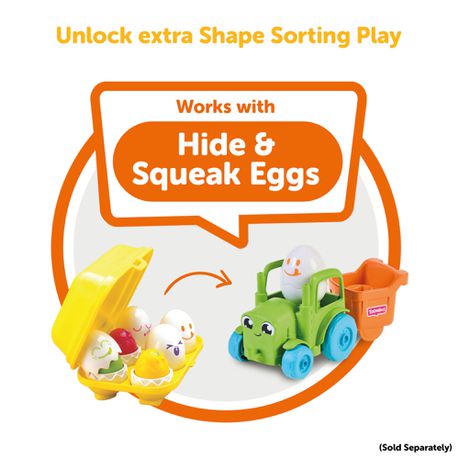 The 2 in 1 Transforming Tractor from Toomies is a clever toy in more ways than one. In fact, it's more than just one toy! It's a dumper truck with a tipper on the back that rests on a pair of hydraulic jacks. Lift off the tipper and hitch it round the other side and your truck turns into a tractor towing a trailer. Those jacks are now vertical exhaust pipes and the back wheels have become the front wheels. Like magic! It's still the same toy but it can be totally transformed in seconds! So whether your little ones want fun on the farm or they're crazy about construction, this colourful push-along free-wheeling pal is up for both jobs. With it comes a happy cheeping chick driver that squeaks when you press down. Hide her inside her shell or pop her behind the wheel with her other half in the back. Children as young as 12 months will love the funny faces, bright colours and push-along play. Then, as they grow and develop new motor skills, they'll discover more and more ways to play: mixing and matching the pieces, switching from truck to tractor, and adding to their collection of original Hide and Squeak eggs whose different shaped bases also slot into place. Like other vehicles in the range, they all come with a universal hitch back and front for even more hook and haul fun. No batteries required. Suitable for children 12-36 months and over.