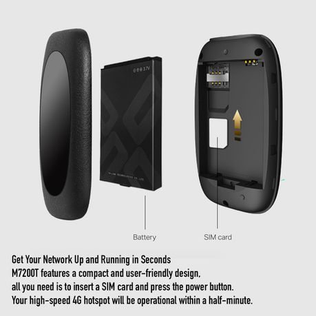 M7200T features a compact and user-friendly design, all you need is to insert a SIM card and press the power button. Your high-speed 4G hotspot will be operational within a half-minute.