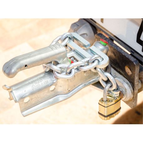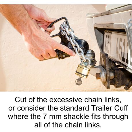 Note, that the 10 mm shackle of the padlock only fits through the end shackle of the chain. It is therefor suited to all open handle trailer couplers shown in the photographs with the green ticks. If you want to use it on a closed handle coupler, you will need to cut the excessive chain links off with an angle grinder or rather consider the standard Trailer Cuff model where the 7 mm shackle fits through all of the chain links.