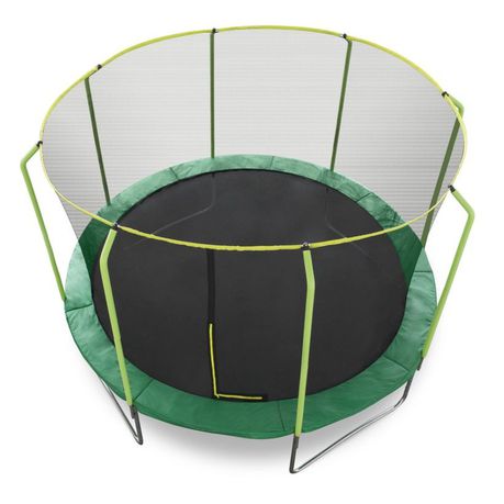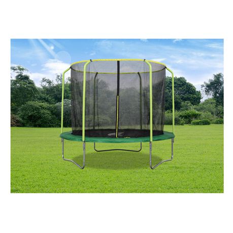 Trampoline is built with a durable, heavy steel frame. The Trampoline has a double thick padded spring cover and safety net enclosure. This trampoline with safety net enclosure is the perfect outdoor addition for any family home! Robust galvanized steel frame, quick and easy to assemble. "L" zip door, opens from inside and outside the enclosure. PVC padding and PE Mesh with high UV resistant performance. Feet height - 70cm.