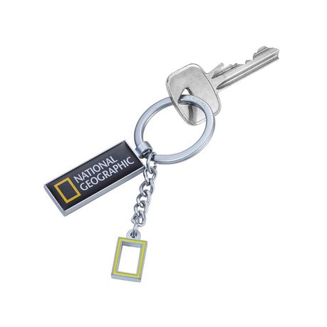 Two-piece TROIKA keyring with the National Geographic logo and yellow rectangular National Geographic emblem, founded in 1888.