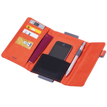 5 inner compartments for passport, credit and business cards + 1 elastic compartment for smartphones up to 5,5'', 1 outer pocket, 2 pen loops, elastic loop for attaching to an A5 notebook or trolley