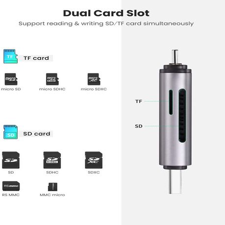 -Supports: SD, SDHC, SDXC, RS-MMC, MMC, Micro SD, Micro SDHC, Micro SDXC and UHS-I cards in large capacity up to 512G