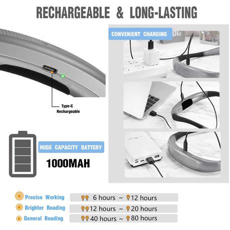 No more holding a flashlight, or wearing a headlamp on your head, nodding your head like a robot to adjust the light direction. These flexible neckband hug lights help you focus on what you are doing, whether for reading in bed or the garden/patio, walking dog, repairing, crafting, working, knitting or the like.