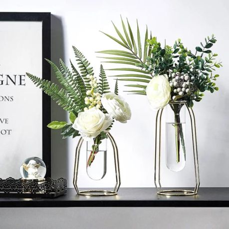Beautiful vases for flowers with metal holder and suspended cylinder shaped glass vase which it is beautiful and practical and adds color for your home. You can remove the vases from their metal vase stand to work with it, it's not permanently fixed to the stand.