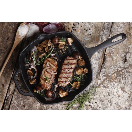 The perfect pan for cranking up the heat - the Victoria Cast Iron Grill Pan is made with higher sides, longer curved handles, drip-free spouts, helper handle and an extra thick body for durability. Perfect for steak, bacon, grilled vegetables, panini and more.