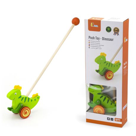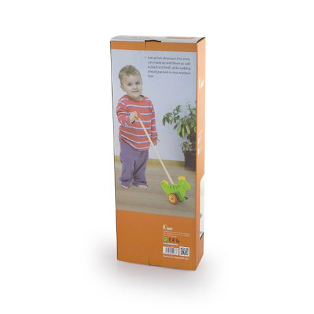 A cute push dinosaur on wheels, its arms flap up and down as the wheels turn. Encourages walking and movement. Suitable for children 18 months and older. Size: 16 x 16 x 7cm and the stick is 50cm