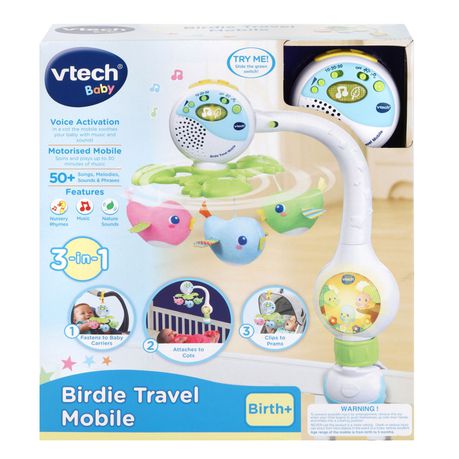 The Birdie Travel Mobile is the perfect mobile for soothing your baby. Comes with a claw fastener and clamp so that you can safely attach to prams, baby carriers and cots. Includes a soothing night light, 3 adorable soft birds and plays 3 songs and 40 melodies. The mobile can also play nature sounds and there is a 10,20 or 30 minute timer. The voice sensor detects your baby s cry and responds with melodies to lull your little one back to sleep. Fits cots with rails that are between 1.02cm and 3.98cm wide. Comes with a claw fastener and clamp so that you can safely attach to prams, baby carriers and cots.
