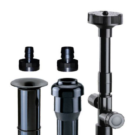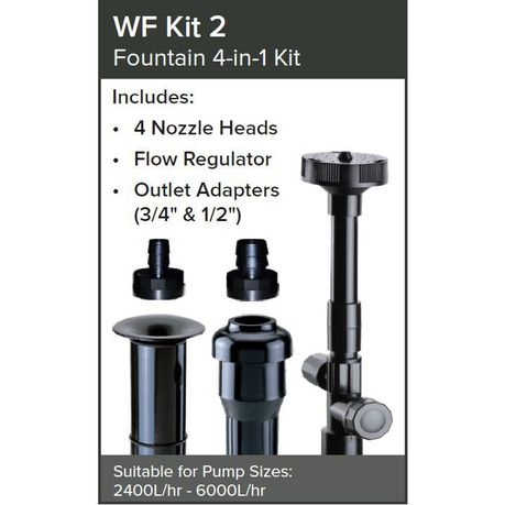 Features: - Suitable for pumps from around 2400l/h to 6000l/h - 4 Fountain / Nozzle Heads Included - Fountain / Nozzles Types include Volcano, Ring Jet & Foam Jet (See Illustrations) - Adjustable Height - Flow Rate can be adjusted with included Flow Regulator - Connects to half '' & three quarters'' Outlets