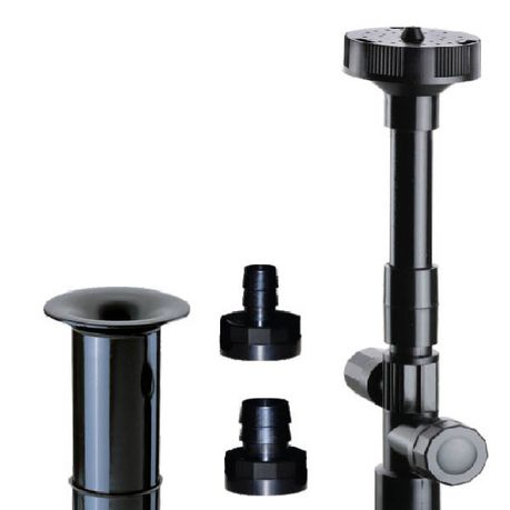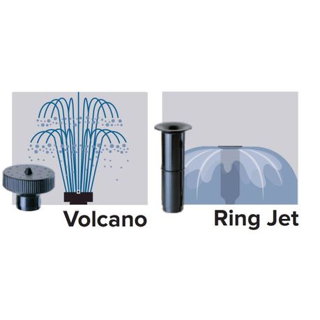 Features: - Suitable for pumps from around 400l/h to 1500l/h - 2 Fountain / Nozzle Heads Included - Fountain / Nozzles Types include Volcano & Ring Jet (See Illustrations) - Adjustable Height - Flow Rate can be adjusted with included Flow Regulator - Connects to 3/8' & half ' Outlets