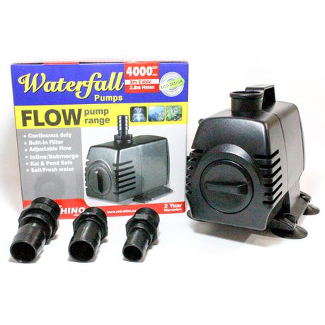 Waterfall Submersible / Inline Flow Water Pump 4000 L/H Waterfall Flow Pumps produces super large flow, ideal for moving large volumes of water through filtration systems or creating a stream or waterfall and is suitable for both submersible pond and in-line on land use. The vortex impeller is efficient & energy saving. The ceramic bearing & shaft provides longer pump life-span with better corrosion resistance. The simple 'no-tool' clip together design makes it easy to disassemble/assemble the inlet housing cover quickly & conveniently. Built-in thermal overload switch has a self-resetting feature to ensure safe operation of the pump, even in strenuous conditions. The unique outer housing design alleviates blockages and the pump has a built-in filter. The pump also has an adjustable flow control feature to allow less water than the maximum to be pumped, should this be required. For in-line on land use, disassemble the inlet housing and fit the supplied threaded fitting to the pump inlet. The pump Does Not have suction/lift capability which means it needs to be installed below the level of the water and then flooded for it to be used in in-line on land mode.