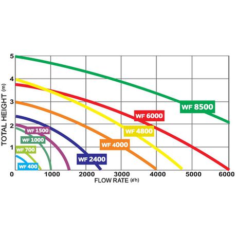 Max Head / Water Cut-Off Height is at 2.8m. Please refer to the supplied Height / Flow Chart to determine the flow capabilities of the pump.