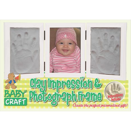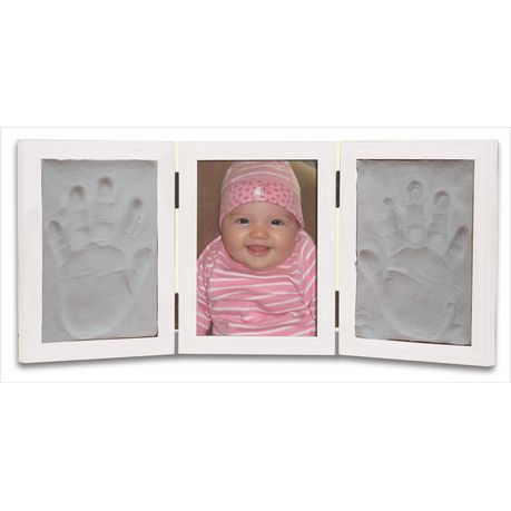 Baby craft - White Three Frame with a place for a photo in the middle and place to make hand or footprint on either side.