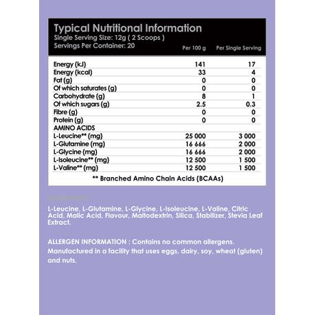 Your essential blend of IBCAA’s ( Instantized Branched Chain Amino Acids ), the building blocks of protein supercharged with the extra benefits of the Amino acids Glycine & Glutamine.