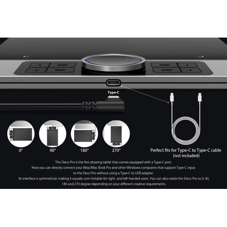 The Deco Pro is the first drawing tablet that comes equipped with a USB-C port. Now you can directly connect your iMac/Mac Book Pro and other Windows computers that support USB-C input to the Deco Pro without using a USB-C to USB adapter. Its interface is symmetrical, making it equally comfortable for right- and left-handed users. You can also rotate the Deco Pro to 0 degree, 90 degree, 180 degree and 270 degree depending on your different creative requirements.