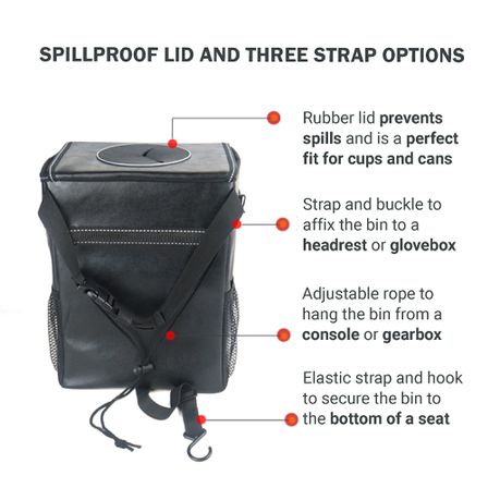 The Car Bin is specially designed to function in a car. It is spillproof, easy to clean, easy to empty, easy to secure, and the ideal size to fit in the small spaces in a car.